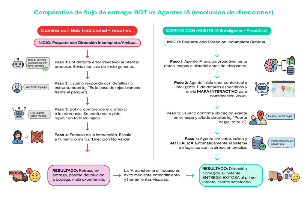 En cambio, los Agentes de IA (Agentic AI) procesan lenguaje natural y contexto. Si un cliente dice: “Vivo en la casa de la puerta negra detrás del parque”, la IA no arroja un error; entiende la referencia, la valida y la convierte en una coordenada geográfica precisa.